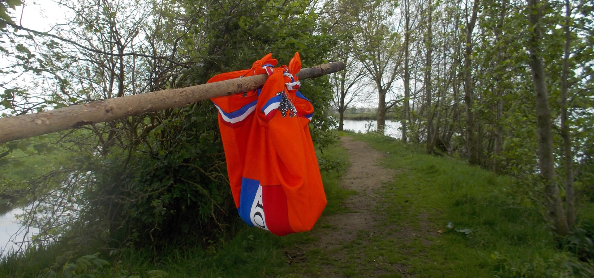 Daar kreeg je een stok en een grote oranje zakdoek om je knapzakje van te maken. Zo gezegd, zo gedaan en met nog wat lekkers erin kon ik op stap. De route was niet gepijld en er was een routebeschrijving. We moesten gewoon het weiland in en aan het eind naar links de kade op en bij Abrona (dat is bij de uitkijktoren) weer door het land terug naar de weg en naar het eindpunt lopen. Kan niet missen !!