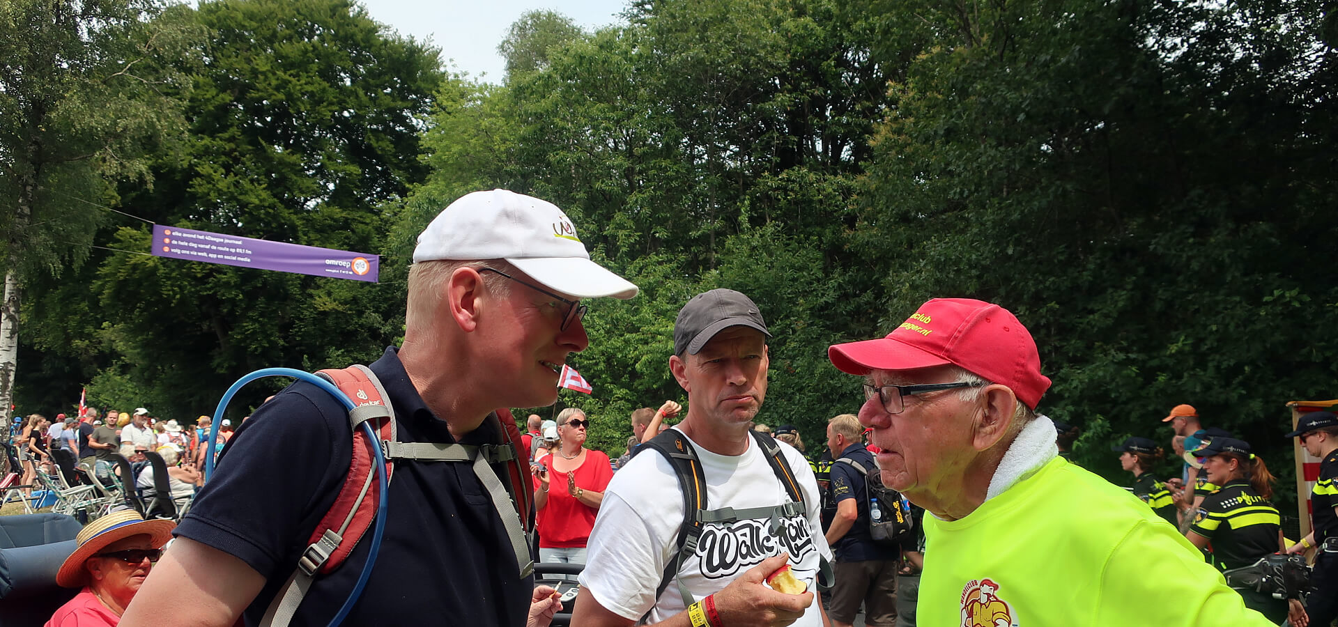 Ik heb vandaag een thuiswedstrijd. Het wandellegioen komt over de Zevenheuvelenweg, dus langs de camping. Bert van de camping heeft mijn stoel (en van enkele anderen) vanochtend al om 6:00 uur langs de weg gezet. Dat is service van de zaak. Ik wordt bijtijds gewekt door de muziek langs de weg. Al snel heb ik geen rust meer in mijn achterste en klokslag half 10 zit ik langs de route. De eerste wandelaars zijn al voorbij. Mondjesmaat komen er snelwandelaars langs. Ze lopen allemaal heel gemakkelijk. Het valt mij op dat zij nauwelijks bagage bij zich hebben. Geen rug- of heuptas. Een enkeling heeft een flesje drank meegenomen. De eerste rolstoelers krijgen groot applaus (de latere overigens ook).