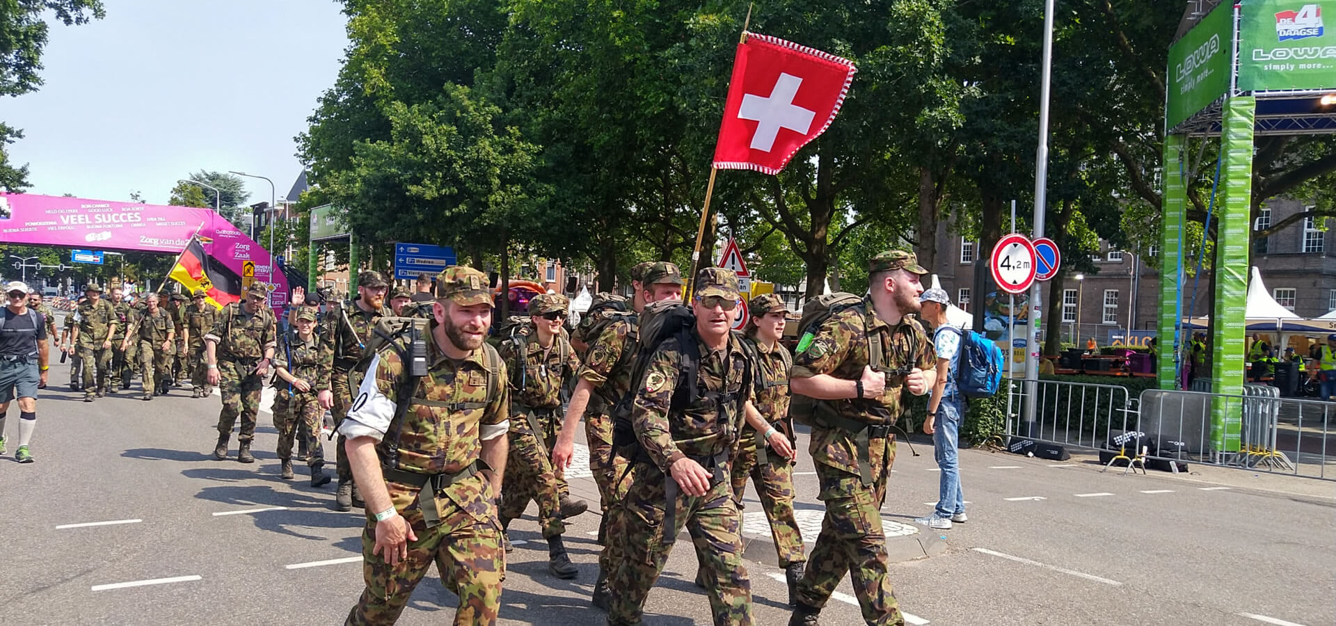 Na de briefing halen we onze kist met spullen en lunchpakketten op. We installeren ons in de tent en maken een praatje met de eerste wandelaars die niks liever willen dan afmelden en douchen. Helaas, ze moeten net als wij nog bijna een half uur wachten. Kort voor 12 uur worden de scanners gebracht. In tussentijd loop ik naar de weg en zie grote groepen militairen langs wandelen. Zij moeten vanaf de Wedren nog zo’n 6km doorlopen naar Heumensoord.