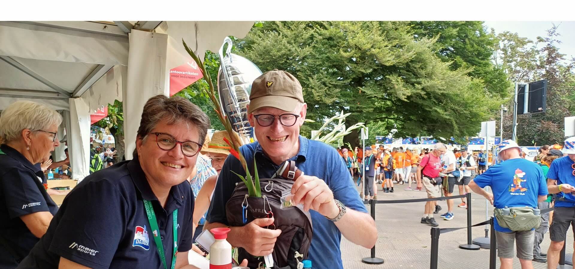 Wij hebben elkaar niet ontmoet tijdens de Vierdaagse, ook al kijken we op de foto behoorlijk verliefd naar elkaar. Deze foto is 2 jaar geleden gemaakt. John kreeg van mij zijn Gouden Kruisje opgespeld. Een speciaal 4Daagse onderonsje en dat zie je op de foto.