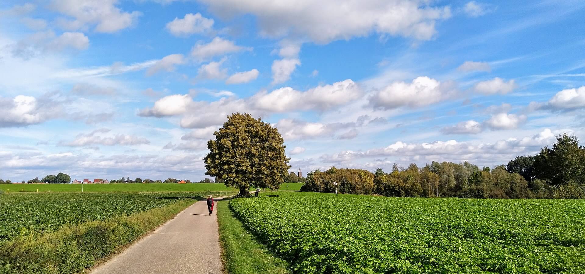 Langs akkervelden wandel ik verder. Ik loop lekker en heb weinig last van mijn knieën. Laat de heuvels maar komen . . .