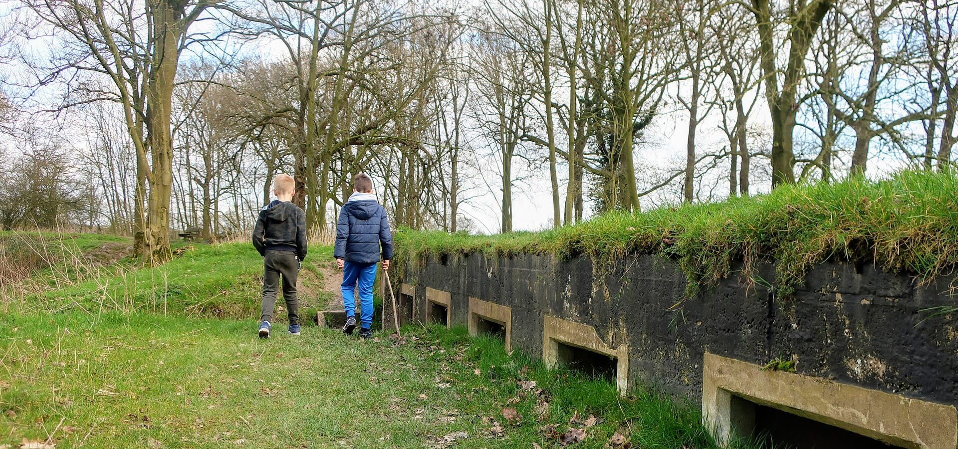 Na Fort Rhijnauwen volgt Kasteel Rhijnauwen. Vandaar wandelen we naar het bunkerpad. Het bunkerpad verbindt Fort bij Rhijnauwen met het Fort bij Vechten. Langs het pad liggen 22 groepsschuilplaatsen en kazematten in het weiland, die gebouwd zijn kort voor de Eerste wereldoorlog uitbrak. Dat boeit de jongens niet maar de bunkers zijn wel leuk om op te klimmen.