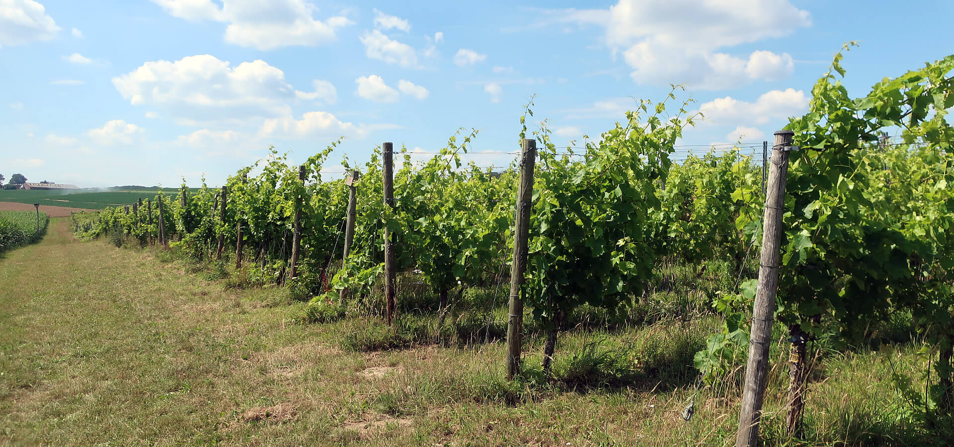 De wijnwandeling gaat verder over leuke onverharde wegen. Het parcours wordt iets heuvelachtiger, thuis zouden wij dit vals plat noemen. Op een zonnige helling ligt een volgende wijngaard. Het blijkt wijngaard Op ’t Hof te zijn, onderdeel van Wijnhoeve de Colonjes.